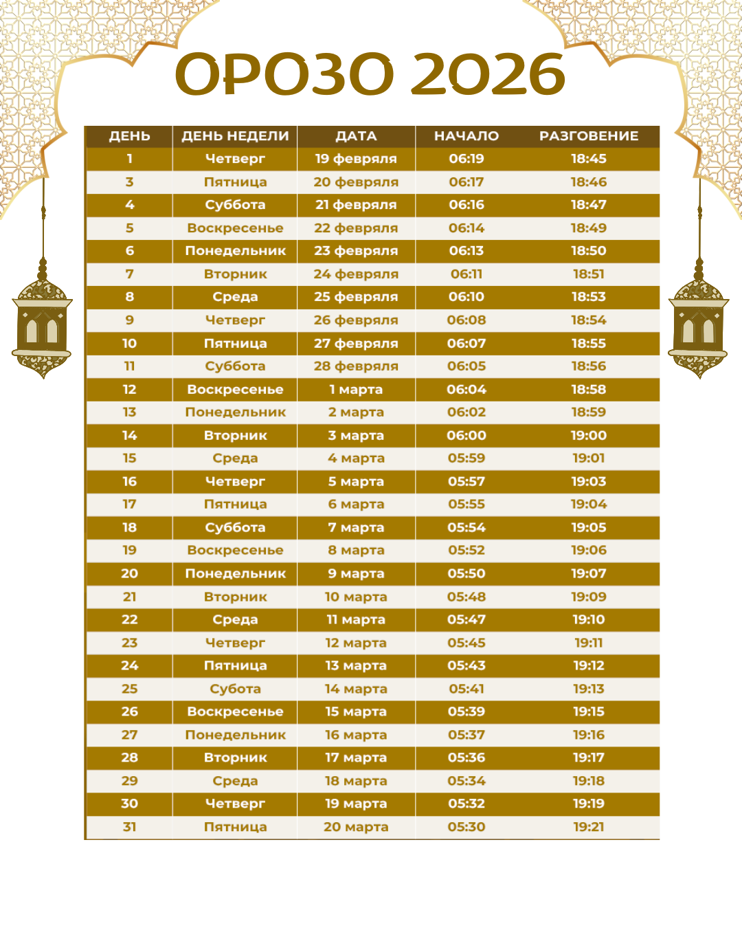 На этой странице вы можете скачать и использовать календарь Орозо 2026 для Бишкека с точным расписанием сухура и ифтара.